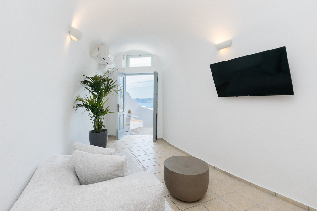 A cycladic cave style accommodation with a Caldera & sunset private view terrace.